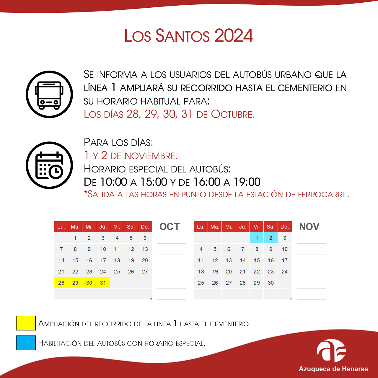 Desde el lunes 28 de octubre y hasta el sábado 2 de noviembre, el recorrido del autobús urbano de Azuqueca de Henares se prolonga hasta el cementerio municipal para facilitar los desplazamientos al recinto con motivo de la festividad de Todos los Santos.