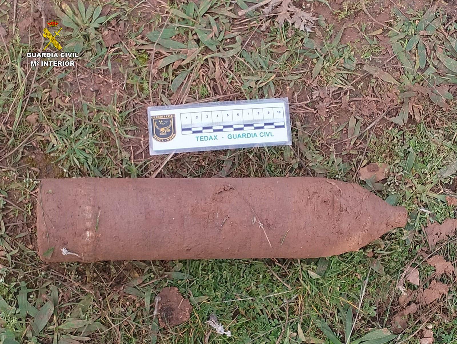 Ayer, la Guardia Civil desactivó un proyectil de artillería originario de la Guerra Civil, localizado por un ciudadano cuando realizaba labores agrícolas en una parcela sita en el término municipal de Bujalaro.