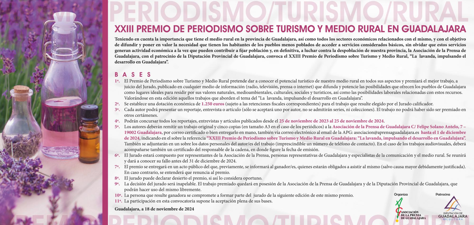Teniendo en cuenta la importancia que tiene el medio rural en la provincia de Guadalajara, así como todos los sectores económicos relacionados con el mismo, y con el objetivo de difundir y poner en valor la necesidad que tienen los habitantes de los pueblos menos habitados de acceder a servicios considerados básicos, sin olvidar que estos servicios generan actividad económica a la vez que pueden contribuir a fijar población y, en definitiva, a luchar contra la despoblación de nuestra provincia, la Asociación de la Prensa de Guadalajara, con el patrocinio de la Diputación Provincial de Guadalajara, convoca el XXIII Premio de Periodismo sobre Turismo y Medio Rural, “La lavanda, impulsando el desarrollo en Guadalajara”.