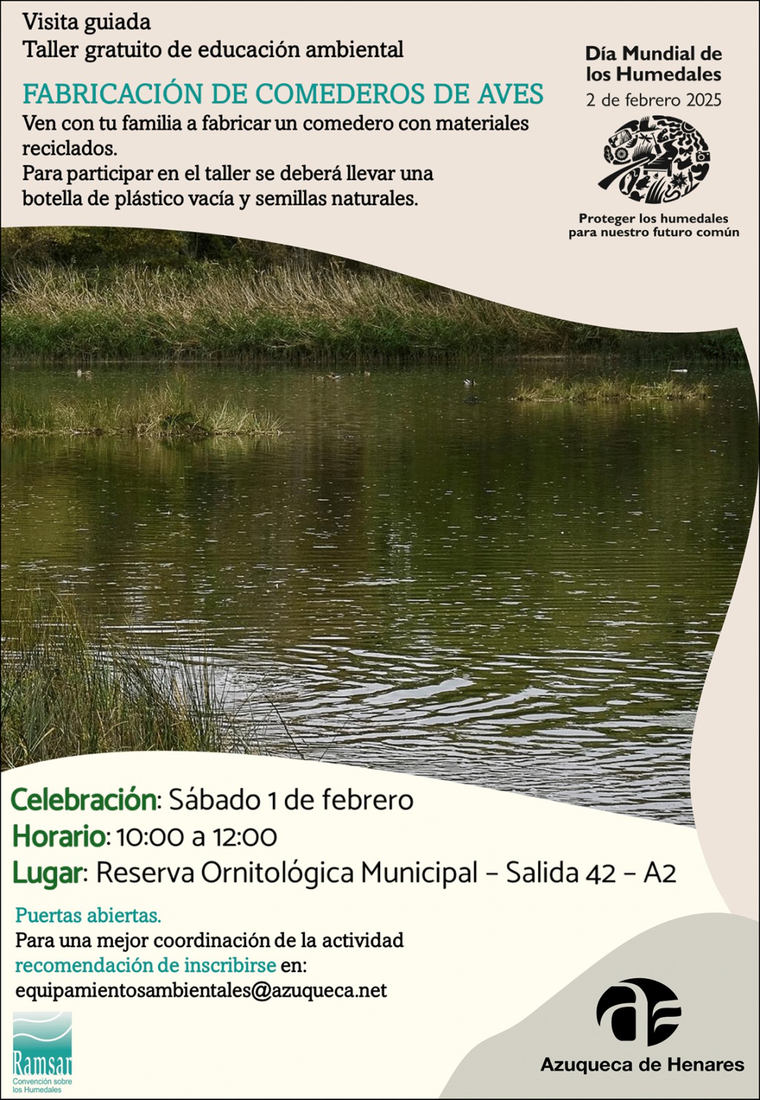 Este sábado 1 de febrero, la Reserva Ornitológica Municipal de Azuqueca de Henares celebrará una actividad especial en conmemoración del Día Mundial de los Humedales. La jornada incluirá una visita guiada por el humedal y un taller familiar para fabricar comederos de aves utilizando materiales reciclados. Los participantes deben llevar una botella de plástico vacía y semillas naturales. La actividad es gratuita, pero se recomienda inscribirse previamente enviando un correo electrónico a [email protected]. El evento comenzará a las 10:00 horas y tendrá una duración aproximada de dos horas.