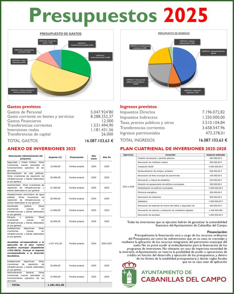 A pesar de las restricciones fiscales a nivel nacional, Cabanillas continúa adelante con importantes proyectos como la construcción del nuevo Centro Acuático y la renovación del alumbrado público. Además, se prevé un incremento del 1,83% en gastos de personal para cubrir subidas salariales y nuevas plazas en la Policía Local.