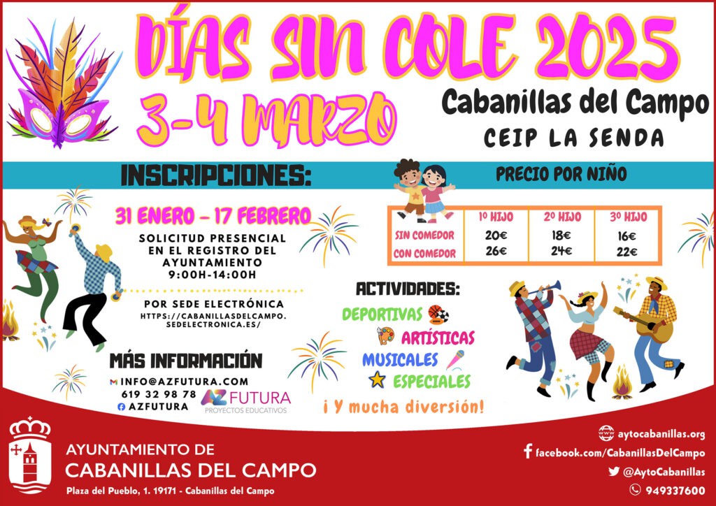 El Ayuntamiento de Cabanillas del Campo organiza un Campamento Urbano para los días 3 y 4 de marzo, coincidiendo con las jornadas no lectivas de Carnaval. Este servicio está destinado a niños y niñas de 3 a 12 años y se llevará a cabo en el Colegio La Senda. Las inscripciones están abiertas desde el 31 de enero hasta el 17 de febrero, con un coste de 20 euros sin comedor y 26 euros con comedor. Se ofrecerán actividades desde las 9:00 hasta las 14:00 horas, además de servicio de aula matinal y comedor. Para más información, se puede consultar la hoja informativa disponible en el sitio web.
