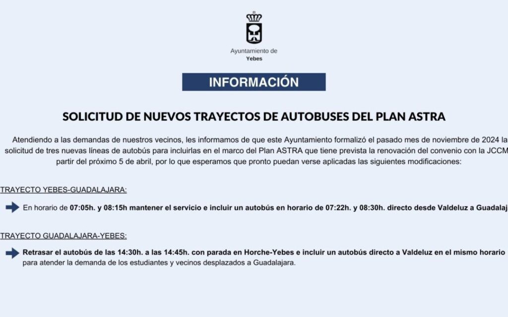 El Ayuntamiento de Yebes ha solicitado la inclusión de tres nuevas líneas de autobús en el Plan ASTRA, atendiendo a las demandas de los vecinos. Esta solicitud se formalizó en noviembre de 2024 y se espera que las modificaciones entren en vigor con la renovación del convenio con la JCCM el 5 de abril. Los cambios propuestos incluyen nuevos horarios para los trayectos entre Yebes y Guadalajara, mejorando así el servicio para estudiantes y residentes. Para más información, visita el enlace.