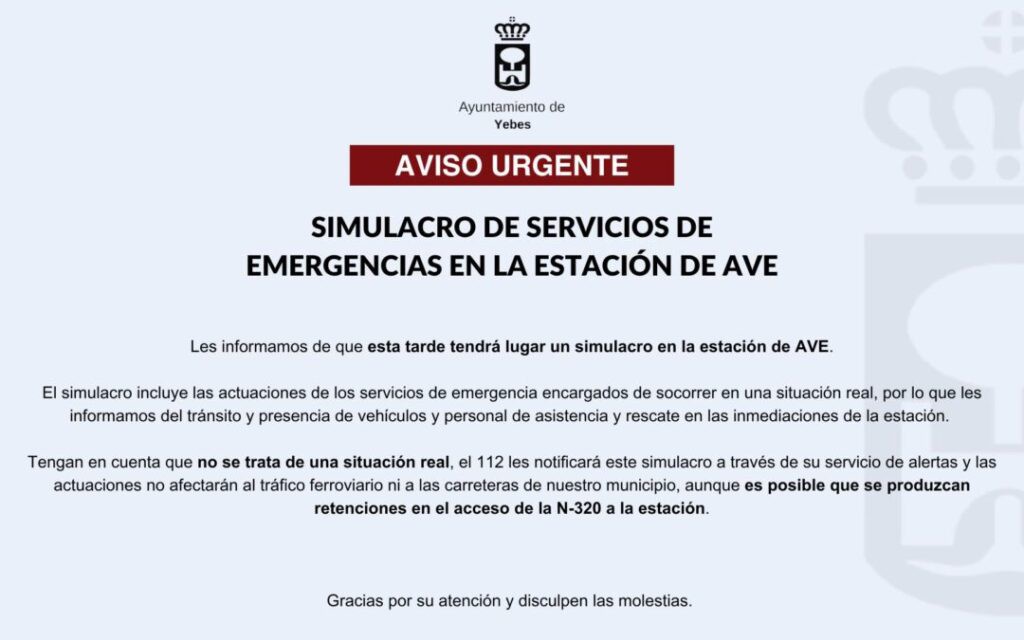 El servicio de emergencias 112 comunicará a la ciudadanía sobre este simulacro a través de sus alertas. Se asegura que las operaciones no interferirán con el tráfico ferroviario ni con las carreteras del municipio. Sin embargo, es posible que se generen algunas retenciones en el acceso desde la N-320 hacia la estación.