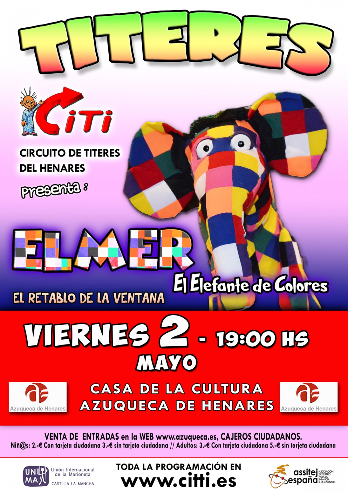 El Ayuntamiento de Azuqueca de Henares ha puesto a disposición del público las entradas para la función de títeres “Elmer, el elefante de colores”, a cargo de la compañía El Retablo de la Ventana. La representación está programada para el viernes 2 de mayo, a las 19 horas, en la Casa de la Cultura.