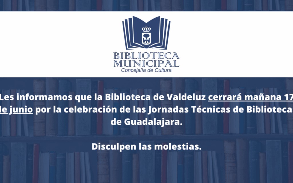 La Biblioteca de Valdeluz estará cerrada el 17 de junio debido a las Jornadas Técnicas de Bibliotecas de Guadalajara. Se informa a los usuarios que se disculpan por las molestias ocasionadas. Para más detalles, visita el enlace a la noticia.