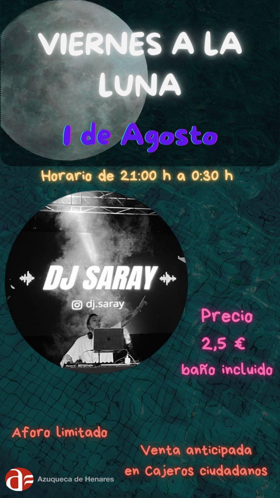 La animación musical a la tercera jornada de "Viernes a la Luna" de este verano, la programada para el 1 de agosto (este viernes), correrá por cuenta de DJ Saray. Las entradas ya están a la venta en los cajeros ciudadanos al precio de 2,5 euros. El recinto abrirá sus puertas a las 21 horas y se podrá disfrutar del baño libre y de la actuación musical hasta las 00:30 horas.