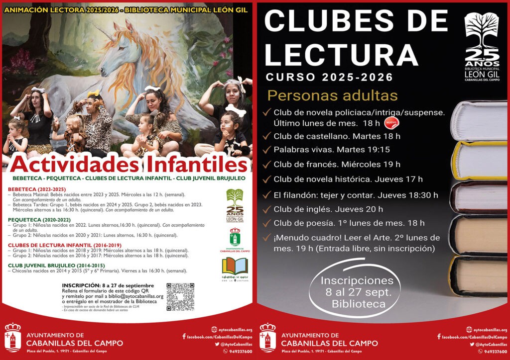 La Biblioteca Municipal León Gil de Cabanillas del Campo ha anunciado el lanzamiento de su Programa de Animación Lectora para el curso 2025-2026, que incluye una variedad de clubes y talleres destinados tanto a niños como a adultos. Entre las novedades destaca la incorporación del «Club de Novela Policiaca, Intriga y Suspense». El periodo de inscripción comenzará el próximo lunes 8 de septiembre y se extenderá hasta el sábado 27.