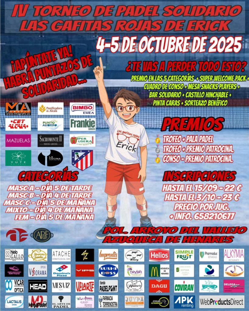 El Ayuntamiento de Quer ha anunciado la celebración del IV Torneo de Pádel Solidario «Las Gafitas Rojas de Erick», programado para los días 4 y 5 de octubre de 2025. Este evento se llevará a cabo en el Polideportivo Arroyo del Vallejo de Azuqueca de Henares, consolidándose como una iniciativa deportiva y benéfica que ha ganado relevancia en la comarca.