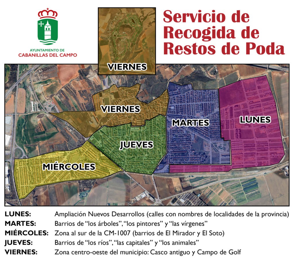 Las jornadas de recogida se mantendrán en su mayoría sin cambios. Los miércoles continuarán con la recolección al sur de la CM-1007, abarcando los barrios de El Mirador y El Soto. Los jueves estarán dedicados a las calles que llevan nombres de ríos, capitales y animales, mientras que los viernes se realizará la recogida en el casco antiguo y en el Campo de Golf.