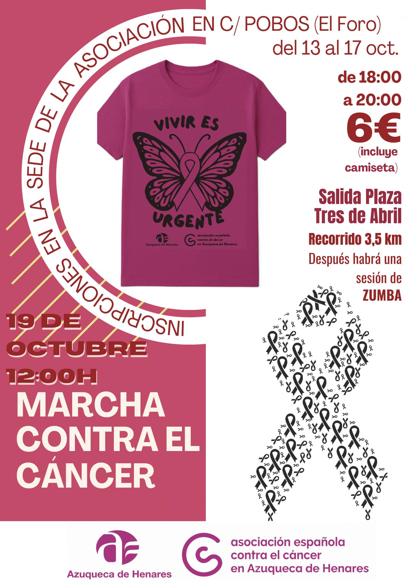 El próximo domingo, 19 de octubre, se celebrará una nueva edición, la cuarta, de la Marcha contra el Cáncer en Azuqueca que organizan la Asociación Española contra el Cáncer en Azuqueca de Henares y el Ayuntamiento azudense. Las inscripciones se podrán hacer desde el lunes 13 hasta el viernes 17, en la sede de la asociación en el edificio de El Foro, de 18 a 20 horas, al precio de 6 euros (incluye la entrega de una camiseta conmemorativa).