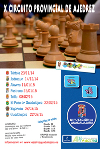 Tórtola de Henares será este domingo, día 23 de noviembre, el punto de partida del X Circuito Provincial de Ajedrez Infantil promovido por la Diputación de Guadalajara y organizado por la Asociación de Ajedrez de Guadalajara y la Delegación Provincial de este deporte. Este torneo, dirigido a menores de 16 años, también recorrerá durante los próximos meses los municipios de Jadraque, Alovera, Pastrana, Trillo, El Pozo de Guadalajara y Sigüenza, para terminar en Guadalajara con la gran final que se disputará el 22 de marzo de 2015.