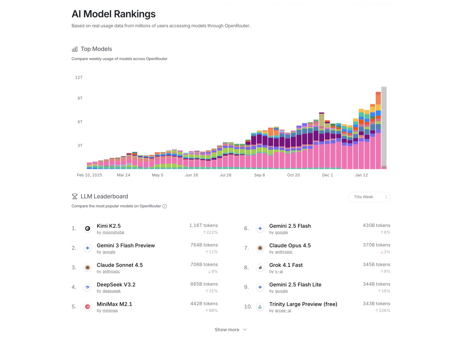 Kimi K2.5 ha mantenido su posición en varios rankings de OpenRouter, incluyendo los de Modelos Top Semanales, Programación, Llamadas a Herramientas y uso específico en Python. Se destaca especialmente en el ranking general semanal —el indicador más fiable de la demanda de modelos— donde logró alcanzar los 1.16 billones de tokens, superando ampliamente a competidores cerrados como Gemini 3 Flash Preview y Claude Sonnet 4.5 por más del 50%.