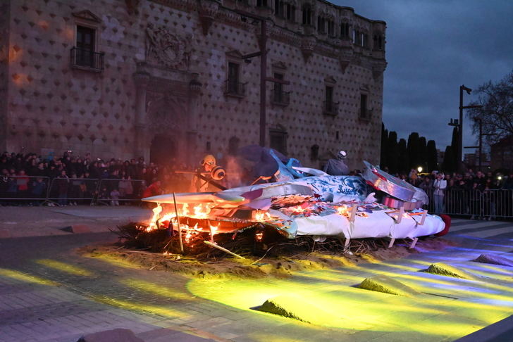 Tras el cortejo, los Bomberos de Guadalajara procedieron a la tradicional quema de la sardina —la misma que el año pasado tuvo que ser indultada a causa de la lluvia—, junto a las sardinas elaboradas por los distintos colegios. El fuego, siempre esperado por los más pequeños, despertó miradas de sorpresa y emoción mientras las llamas se elevaban y el resplandor de la hoguera se reflejaba en la imponente fachada del Palacio del Infantado, creando una estampa tan simbólica como inolvidable para cerrar el Carnaval.