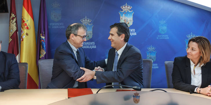 El Alcalde de Guadalajara, Antonio Román, y el Director de SIDECU S.L, Guillermo Druet, han suscrito esta mañana un convenio de colaboración que posibilitará que la mayoría de las personas contratadas en el nuevo Centro Acuático Municipal sean de Guadalajara.