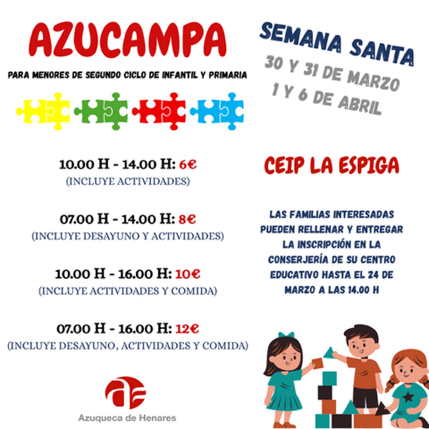 El Ayuntamiento de Azuqueca de Henares ha dado a conocer la apertura de inscripciones para una nueva edición de Azucampa, un campamento urbano que se llevará a cabo durante las vacaciones escolares de Semana Santa. Las actividades están dirigidas a los alumnos del segundo ciclo de Educación Infantil y Primaria, y se desarrollarán los días 30 y 31 de marzo, así como el 1 y 6 de abril.