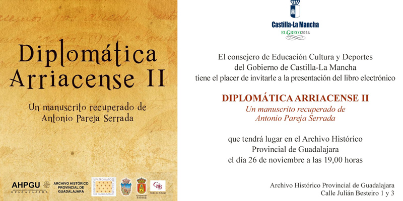 El Archivo Histórico Provincial de Guadalajara, dependiente de la Junta de Comunidades de Castilla-La Mancha, será ele escenario de la presentación del libro electrónico “Diplomática Arriacense II”, un manuscrito recuperado del cronista Antonio pareja Serrada. El acto tendrá lugar en el Archivo Histórico Provincial, situado en la calle Julián Besteiro 1 y 3, el próximo miércoles 26 de noviembre a las 19 horas.