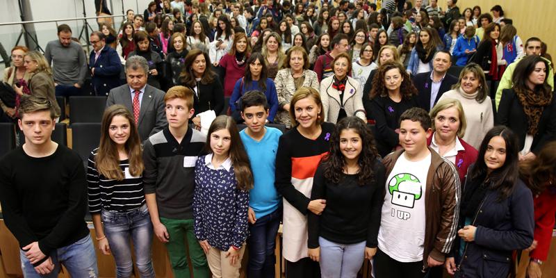 Durante su intervención en la clausura del acto institucional en el que se ha conmemorado el Día Internacional contra la Violencia hacia las Mujeres, celebrado en Toledo, que este año se ha dedicado a la prevención de la violencia en la adolescencia, Cospedal se ha dirigido a las alumnas y a los alumnos de diferentes institutos de la región presentes y les ha pedido que no estén dispuestos a aceptar esas conductas.