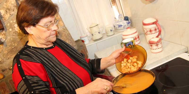 Lo primero es poner a calentar el aceite de oliva en una sartén honda. Cuando ha cogido temperatura, se vierte la panceta. En ese mismo aceite, ya mezclado con la grasilla de la carne, se añaden cuatro o cinco ajos pelados. Una vez han dejado su gusto, siempre sin que se quemen lo más mínimo, porque si se pasan lo estropean todo, Felipa los retira. Hay quien los deja. Es el momento de poner la harina, “siempre de almortas, nunca de trigo”, puntualiza la morillejana, a razón de dos cucharadas por persona. La mixtura se tuesta al fuego, al tiempo que se espolvorea con cuidado de media a una cucharada de pimentón rojo, a gusto de cada familia. A los Sotodosos-Rodrigo, les gustan bien coloraditas.