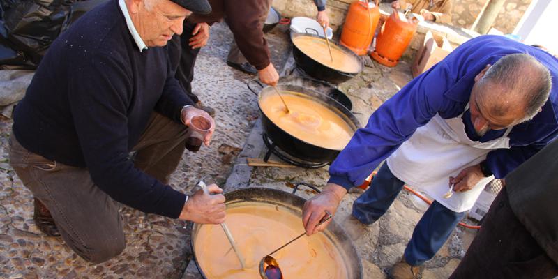 Lorenzo Largo, el presidente de la Asociación, decía que se han repartido más de doscientas raciones consistentes en un plato de gachas y un chorizo. Juan Nadador, “sin agua”, se apresuraba a decir con gracia el pastranero, explicaba la receta, tan sencilla como suculenta: “Se pica panceta en trocitos pequeños y se fríe. Después se añade la harina, de almorta. Tuestas un poquito lo que va saliendo, y se añade agua. A partir de ahí, vueltas y vueltas hasta darle la consistencia. Cuando todo cuaja y se cuece bien, a comer”.