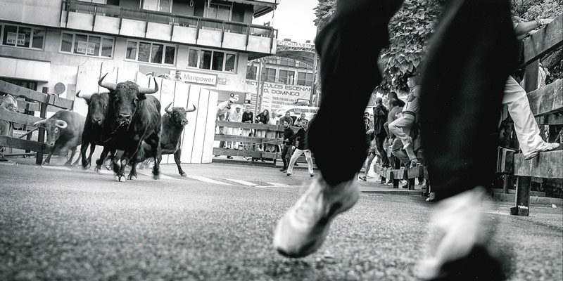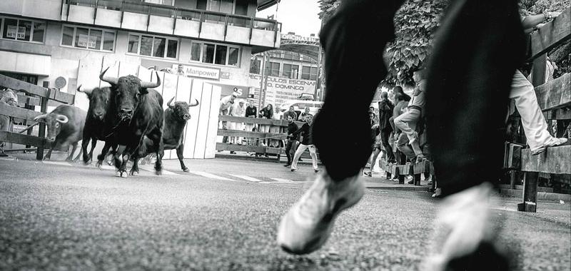 El tercer premio fue para la foto “En pleno vuelo”, de Borja Blanco Pezuela. Sus dos protagonistas, mozo que salta y res, están detenidos en el aire con una nitidez extraordinaria. “Es un toro jabonero precioso, cuatreño, de la ganadería de Sopeña, muy fuerte”, describe Muñoz. El cuarto premio correspondió a Virgilio Hernando, también un fotógrafo guadalajareño. “La suya es una imagen diferente, con un punto artístico. El autor tenía perfectamente claro en su cabeza lo que quería, antes de que la imagen se quedase grabada en la tarjeta de memoria de su cámara. La manada de toros está perfectamente enfocada al fondo, mientras que los pies del corredor aparecen difuminados”.