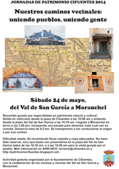 La salida será en vehículos desde la Plaza Mayor de Cifuentes a las 10 de la mañana. Los más madrugadores, si están a las 10,00 h. ya en El Val de San García y hasta la hora de arranque de la jornada (10,30 horas), podrán disfrutar de un recorrido guiado por las calles de la localidad. La llegada a Moranchel se estima en torno a las 15,00 horas, por lo que se tomará un tentempié que llevará cada participante. Una vez en Moranchel, en el bar se hará una comida más formal y compartir un rato juntos mientras se descansa de la jornada. Para quien siga con más ganas de marcha, después del café se realizará una visita guiada por el pueblo.