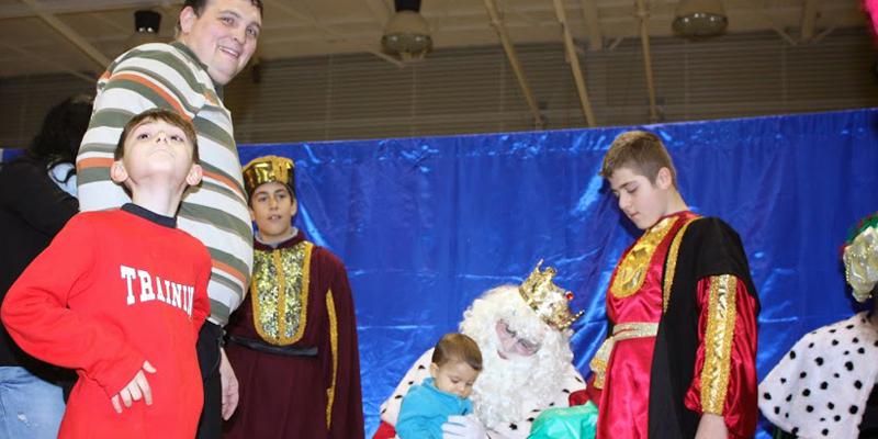 Ya en el colegio, los Reyes Magos subieron al escenario también decorado por voluntarios seteros. Lourdes Jiménez se encargó de darles la bienvenida y de presentarlos a la sociedad local. Después adoraron al niño en su portal en el tradicional Belén Viviente antes de ocupar sus tronos para repartir los regalos que traían para los pequeños. Este año el Niño Jesús ha sido el pequeño Darío. Casi 200 niños pasaron por delante de sus majestades para recibir de sus manos un regalo de acuerdo con la edad de cada uno de ellos.