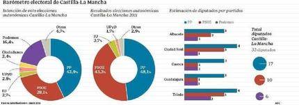 Nueva encuesta que este lunes publica el diario ABC. El Partido Popular que lidera a nivel regional la presidenta de Castilla-La Mancha, María Dolores de Cospedal, revalidaría la mayoría absoluta que posee actualmente de realizarse ahora las elecciones autonómicas. Con la nueva configuración del Parlamento regional de 33 escaños, tras la reforma del Estatuto de Autonomía, los «populares» llegarían a los 17 que otorgan el gobierno de la región, mientras que los socialistas solo alcanzarían diez parlamentarios y Podemos recibiría un apreciable respaldo hasta llegar a los seis diputados.