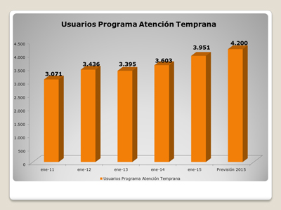 Desde principios de 2011, el número de menores que reciben Atención Temprana se ha incrementado en un 30 por ciento, pasando de los 3.071 a los 3.951 menores de 0 a 6 años atendidos. Según ha avanzado Echániz, “la previsión es que para 2015 este crecimiento se mantenga y se llegue a atender a cerca de 4.200 niños de 0 a 6 años”.