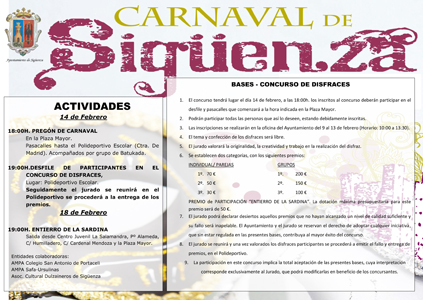 El Ayuntamiento de Sigüenza convocó hace unos días su tradicional concurso de disfraces de Carnaval. Como cada año, está abierto a la participación de público de todas las edades. La única condición es la figurar inscrito en el listado que prepara la animación sociocultural del Consistorio. Las inscripciones deben realizarse en la Oficina del Ayuntamiento (entre las 10:00 y las 13:30 horas), hasta el día 13 de febrero, un día antes de la celebración del evento (14 de febrero).