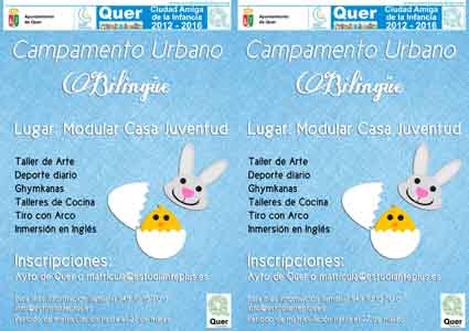 El Ayuntamiento de Quer abrirá este próximo miércoles, día 11 de marzo, el plazo de inscripción al campamento urbano de Semana Santa hasta el viernes, día 27 de marzo. Como cada año, desde la concejalía de Bienestar Social, mantiene la oferta para ayudar a las familias seteras a conciliar la vida laboral con la familiar. El campamento abrirá por vacaciones en Semana Santa durante los tres días, lunes, martes y miércoles (30 y 31 de marzo y 1 de abril) en los que no habrá clase por motivo de las vacaciones escolares de Semana Santa.