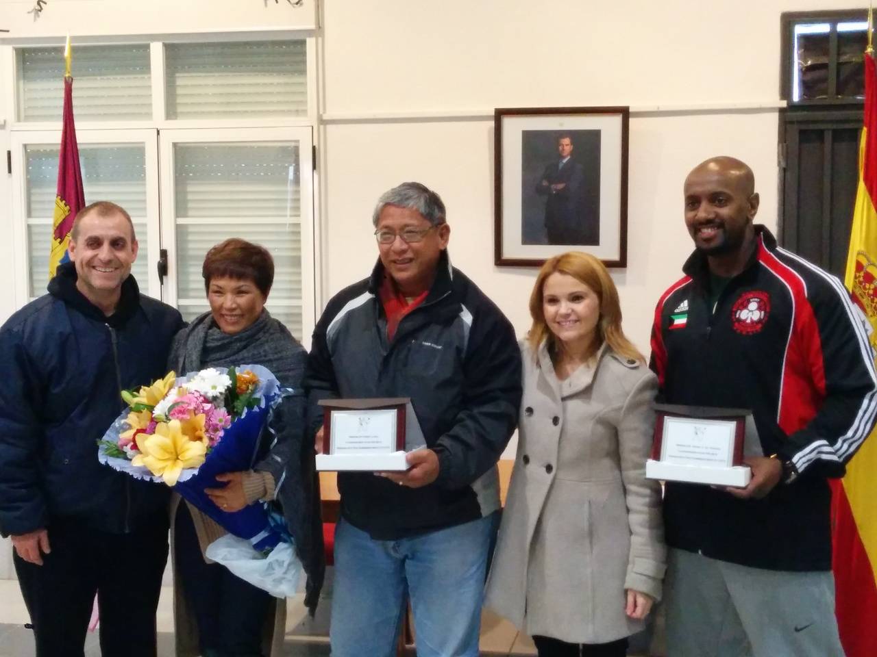 Marta Valdenebro recibe al gran maestro de kajukenbo Robert New y el sifu Ahmed N. Bu-Marzouq en su visita a Villanueva de la Torre