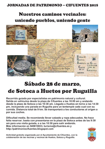 El próximo sábado 28 de marzo tendrá lugar la segunda Jornada de Patrimonio prevista para este año 2015 por el Ayuntamiento de Cifuentes, recorriendo el camino de Sotoca de Tajo a Huetos, pasando por Ruguilla. Una ruta por las estribaciones de la Alcarria y del Geoparque del Alto Tajo.