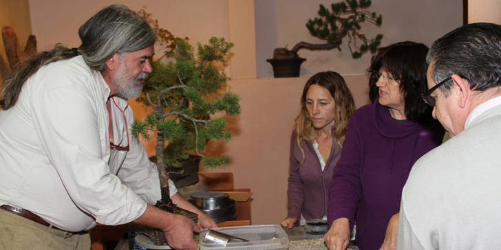 A continuación resumió cuáles son esas técnicas, que “básicamente consisten en cortar las raíces pivotantes, favorecer las raíces laterales, de manera que las plantas, en lugar de hacia arriba, lo hagan a lo ancho y parezcan más antiguas y más venerables”. Ariño terminó la primera clase describiendo, y llevando a cabo, un trasplante. “También hemos hablado sobre las clases de tierra que deben contener las macetas que dan pie a los bonsáis, cómo mezclar una buena base, cómo regar, es fundamental un excelente drenaje, cómo abonar, y, una vez hecho el trasplante, cómo podar las raíces”. Ariño trasplantó un pino a una maceta, aprovechando su acción para mostrar a los alumnos cómo se deben podar las raíces para conseguir el diseño deseado. Para la siguiente sesión, quedan la poda de las ramas, el abono y la elección de las plantas adecuadas.