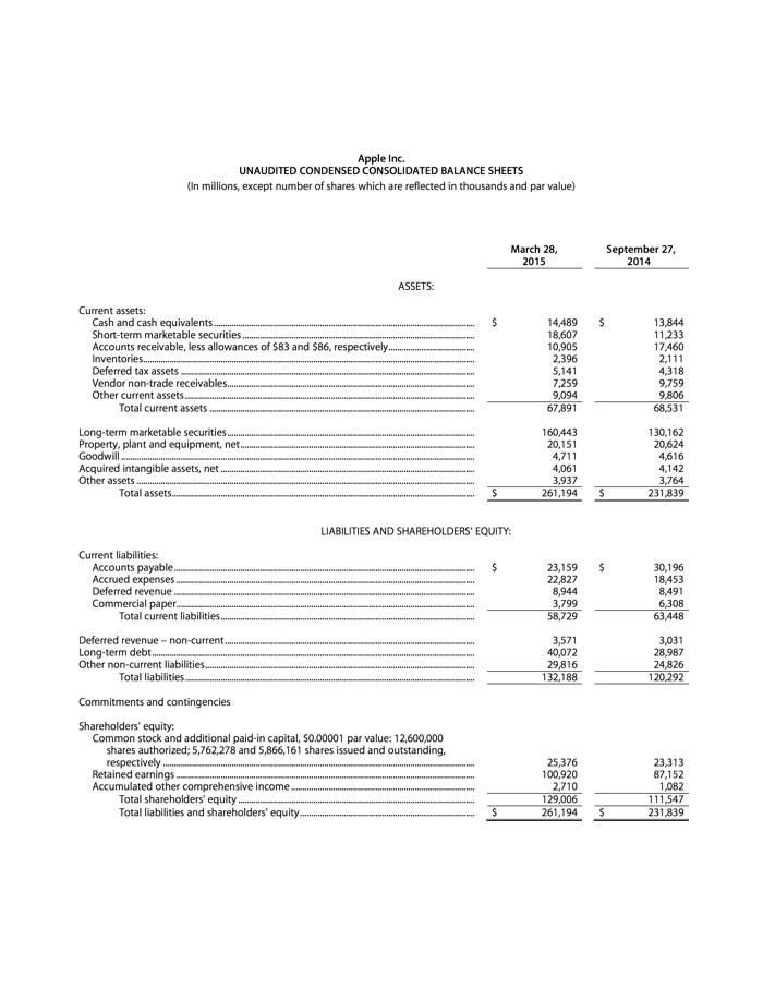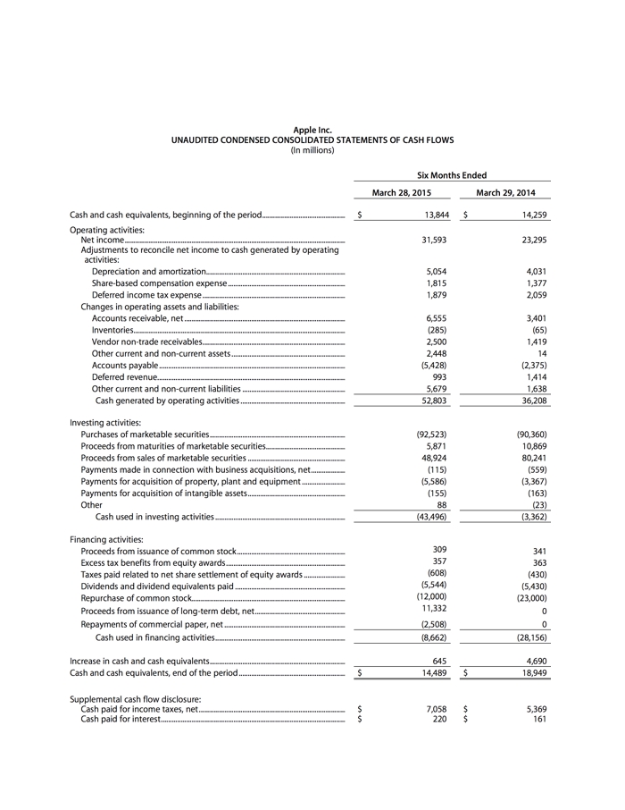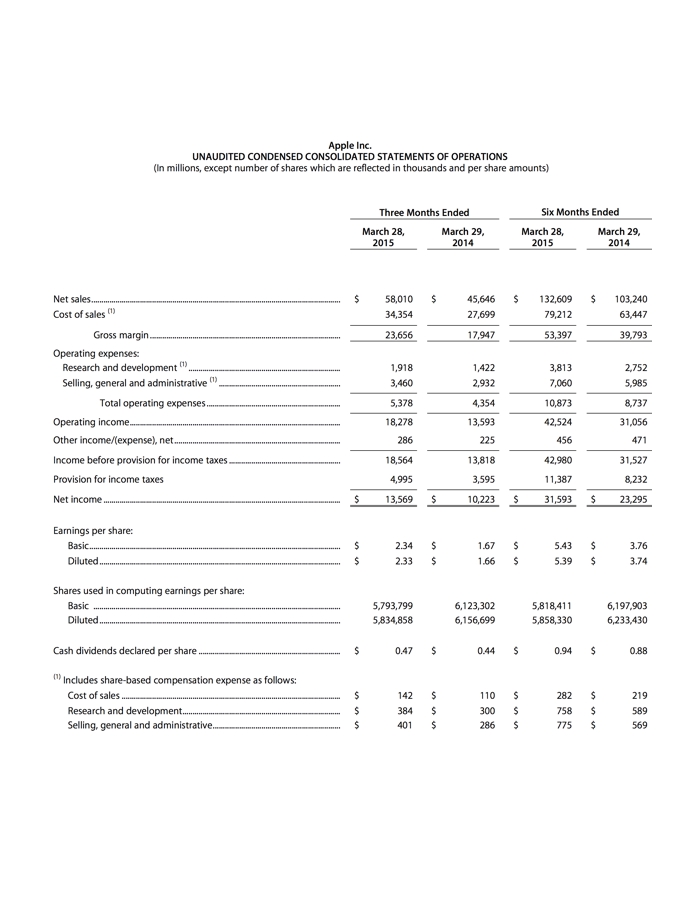 Apple ha desvelado los resultados financieros del segundo trimestre de su año fiscal 2015, cerrado el 28 de marzo de 2015. La compañía ha registrado unas ventas trimestrales de 58.000 millones de dólares y un beneficio neto trimestral de 13.600 millones de dólares, equivalente a 2,33 dólares por acción.