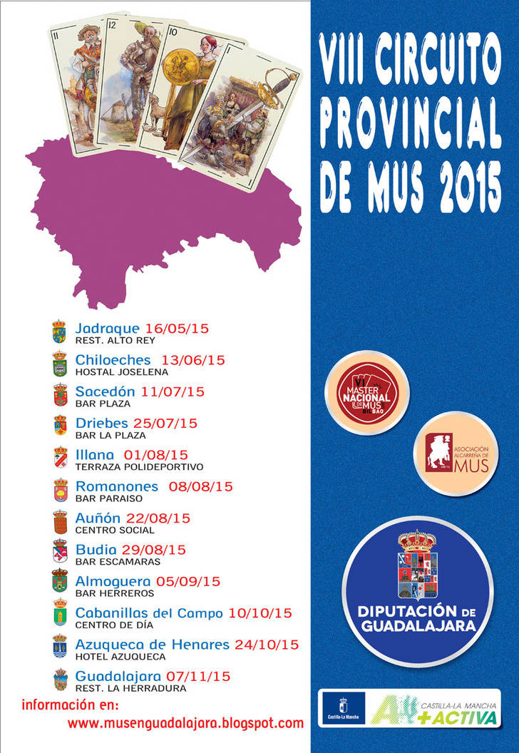 El próximo sábado, 16 de mayo, a partir de las 16:30 horas en el Restaurante “Alto Rey” de Jadraque se celebrará la primera Fase Local del VIII Circuito Provincial de Mus, que organiza la Diputación de Guadalajara con la colaboración de la Asociación Alcarreña de Mus.